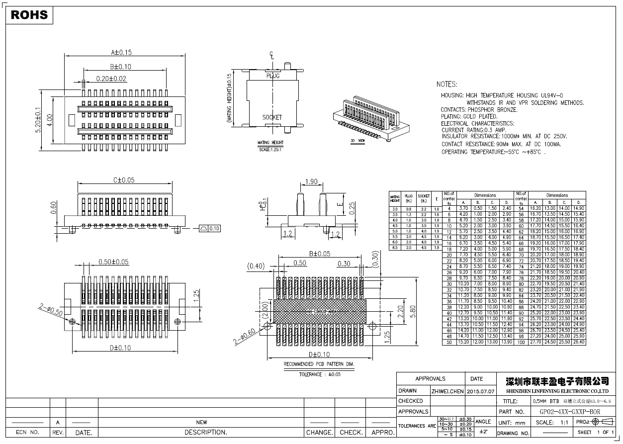 產(chǎn)品簡介品名:0.5mm雙槽板對板連接器公座型號:LFY02-4xx-GxxP-BOR規(guī)格:0.5mm間距/立式180°PIN數(shù):4-100PIN塑膠顏色:黑色