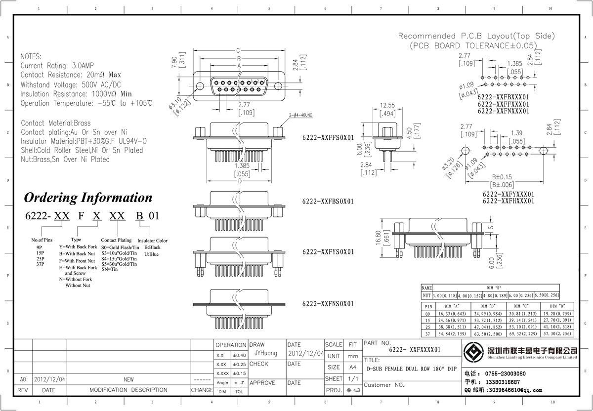 技術(shù)參數(shù):額定電流:3.0amp電流電阻:25mΩ最大絕緣電阻:1000mΩ min 承受電壓:AC 500V /分鐘工作溫度:55﹣℃+ 105℃接觸材料:黃銅觸點(diǎn)電鍍金或錫鎳絕緣體材質(zhì):聚酯(UL94V-0)標(biāo)準(zhǔn):PBT的+ 30%廣發(fā)殼:冷軋輥鋼、鍍鎳黃銅、錫在螺母:鍍鎳