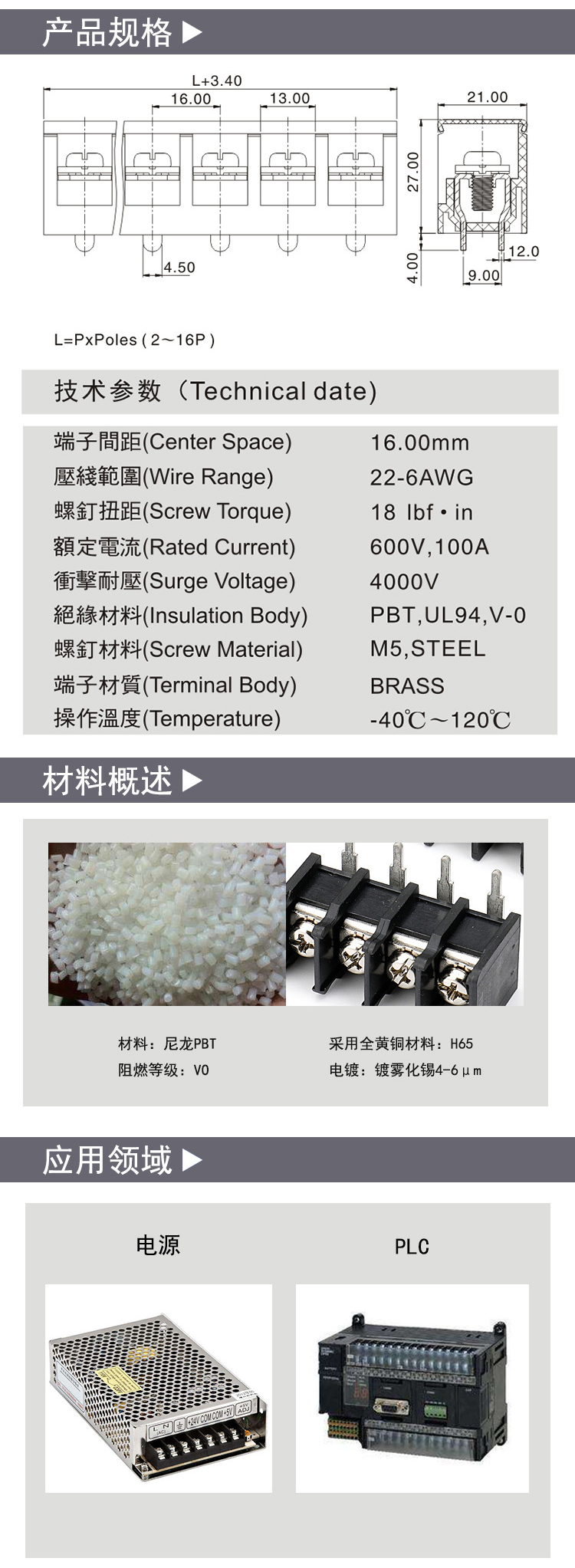 柵欄式PCB接線端子焊腳16.0間距;技術(shù)參數(shù)