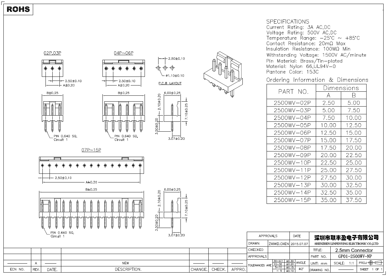 LFY01-2500WV-NP產(chǎn)品簡介品名:線對板連接器規(guī)格:直式/插件180°間距:2.50mmPIN數(shù):2-15PIN